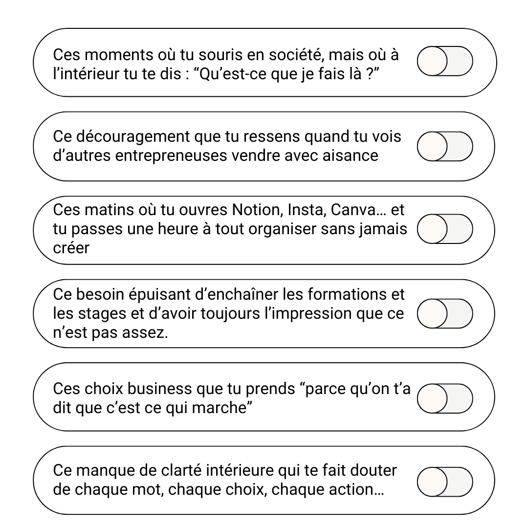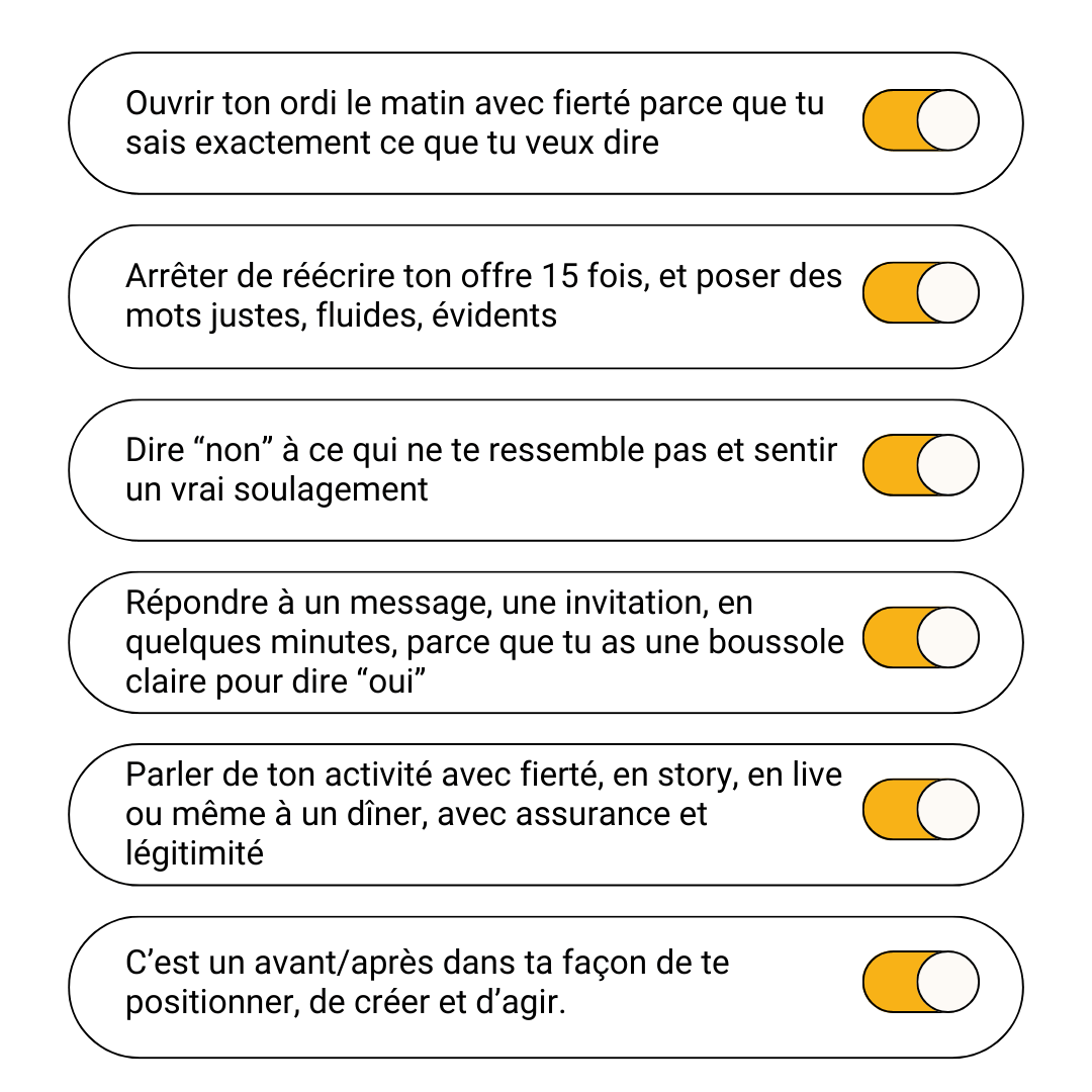Voilà ta méthode en 5 étapes pour (re)prendre ta place — quand tu t’exprimes en live, quand tu présentes ton offre, quand tu écris un post… Tu sauras quoi dire, quoi choisir, et pourquoi c’est juste pour toi.