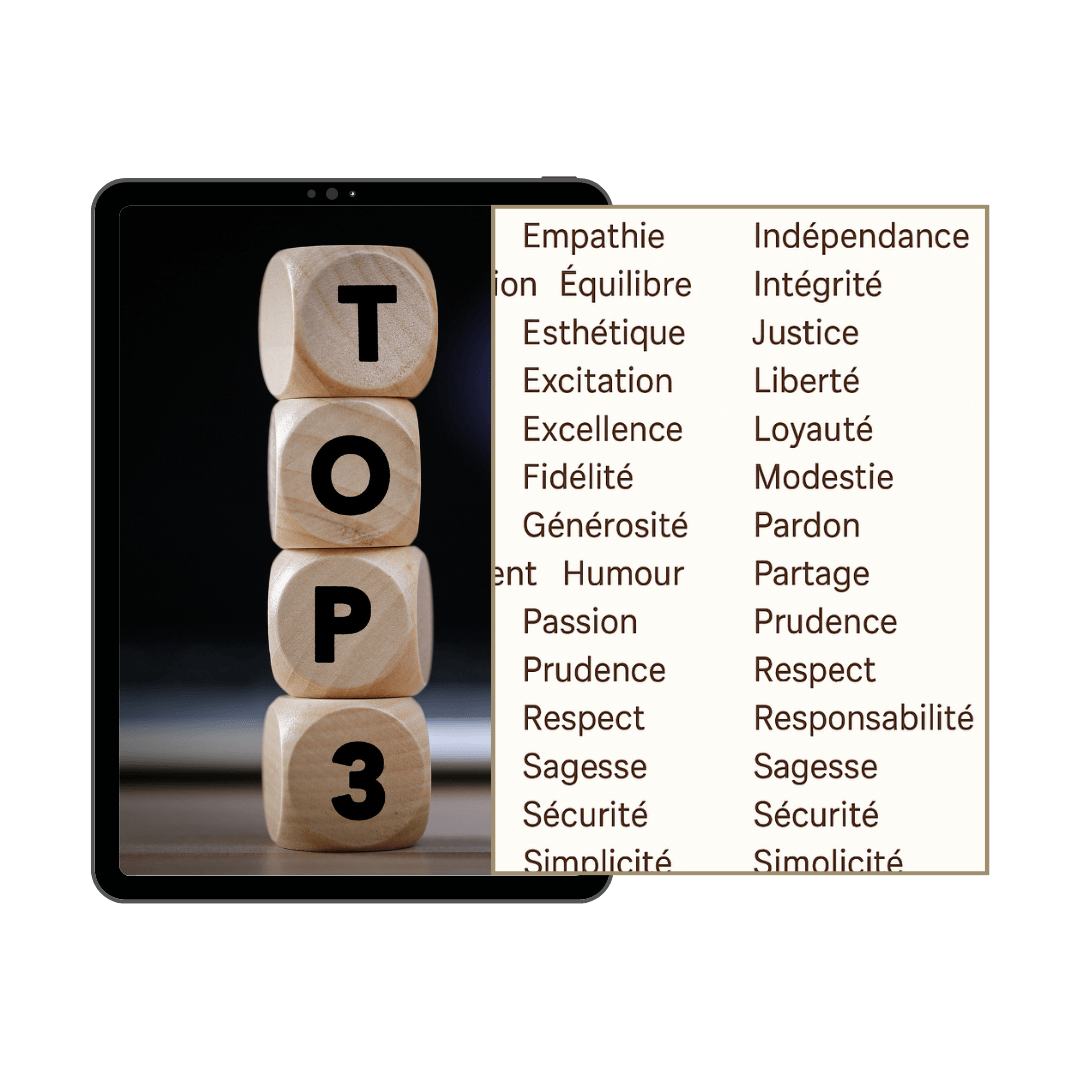 + BONUS : Tu identifies tes 3 valeurs hautes, comme un GPS intérieur qui te guide dans chaque décision, sans avoir besoin de demander l’avis à tout le monde