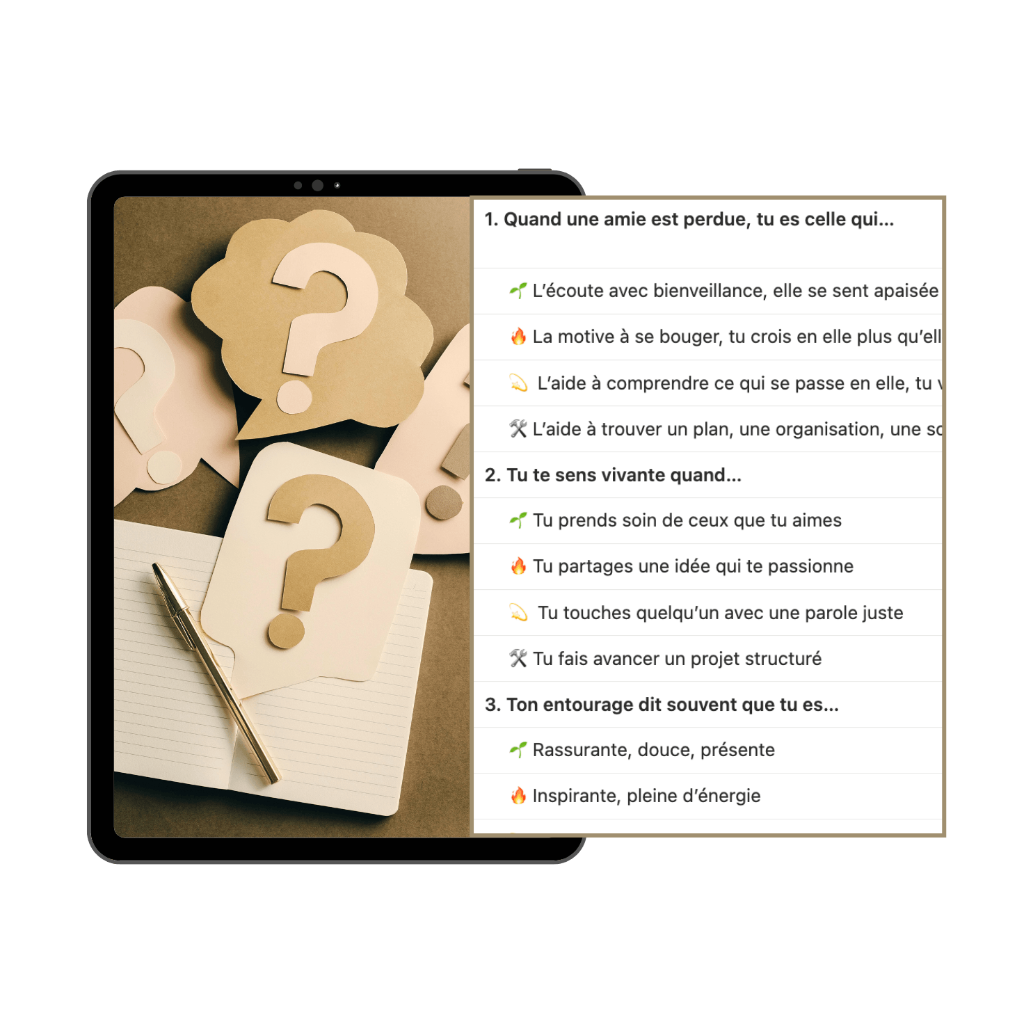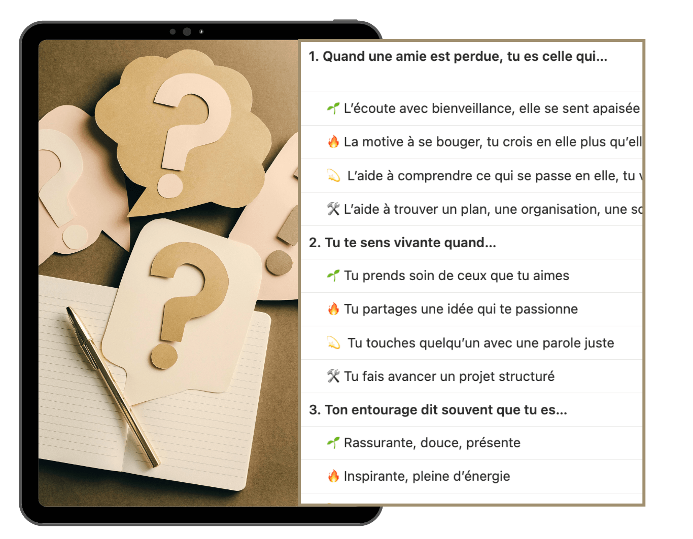 Tu identifies tes 3 valeurs hautes à travers un système de choix guidés. Elles t’aident à (re)prendre ta place, à faire des choix alignés, et à oser te montrer telle que tu es.